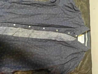 Camicie taglia L. Due in velluto, una nera e una beige (Misure: 61 cm spalla e 75 cm altezza). L'altra a quadri larghi in due toni di blu, marca Solid (Misure: 56 cm spalla e 67 cm altezza). Quelle in velluto costano 5 €, quella blu 4 €. Se vuoi vederle indossate, possiamo incontrarci in un negozio e te le provi.