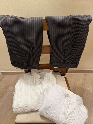 Set di pantaloni a righe grigie e due camicie bianche. Pantaloni con righe diplomatiche. Camicie con colletto mao e dettagli plissettati.