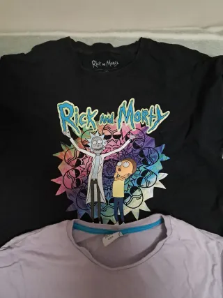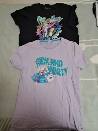 Set di due camicie con design di Rick and Morty. - Camicia nera con stampa di Rick e Morty. Taglia L - Camicia viola con design di Rick and Morty sulla navicella spaziale. Taglia M
