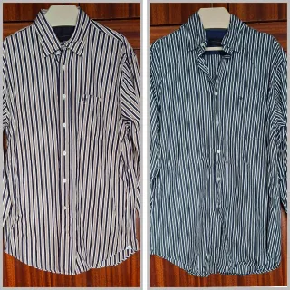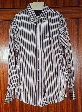 Camicie a maniche lunghe del marchio Pedro del Hierro con un design a righe verticali. Una combina verde e blu e l'altra moka e bordeaux. Taglia L. Combinazione di colori beige e blu.