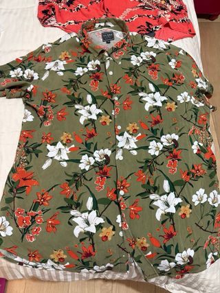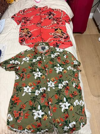Conjunto de dos camisas de manga corta de la marca Guess. - Camisa roja con estampado tropical y figuras. - Camisa verde con estampado floral de lirios y otras flores.