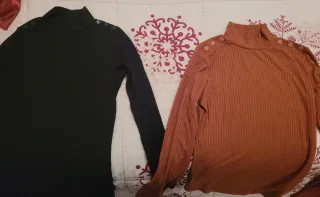 Set di due camicie a colletto alto con dettaglio di bottoni sulle spalle. - Camicia nera a costine. - Camicia arancione marrone a costine.