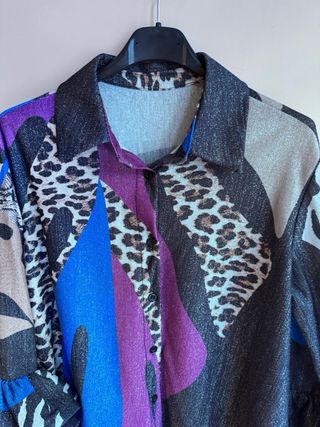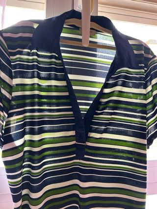 Camicia originale ETRO Milano da donna, con stampa a righe multicolor (toni verdi, rosa, terra e linee scure). Manica lunga, colletto e chiusura con bottoni. Taglio comodo con fondo arrotondato, ideale per look casual chic o da ufficio. • Taglia: 44 italiana 40 Spagna • Prodotto in: Italia (Made in Italy) • Lunghezza approssimativa: ~80 cm (vedi foto con metro) • Condizione: ottimo - Realizzata in Italia. - Etichetta interna con il nome del marchio e della città. Consegna a mano o spedizione tramite Wallapop.
