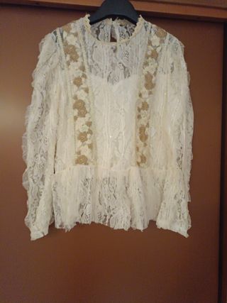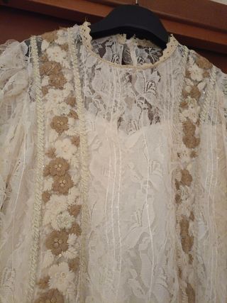 Elegante camicetta da donna con dettagli in pizzo. - Maniche lunghe in pizzo. - Collo alto con volant. - Decorazioni floreali applicate. - Fondo a balze.