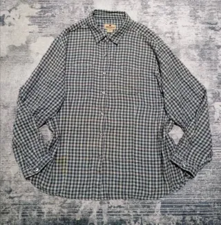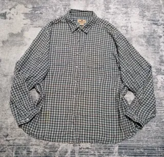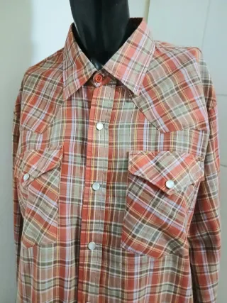 Camicia ampia a quadri con un tocco di filo dorato. Leggera e versatile. Tg.M/L donna Bottoni madreperlati, 2 tasche con bottone, maniche lunghe con bottone, chiusura 6 bottoni+ 1 rosso Lunghezza 78, spalle 46, maniche 62, colletto 7.5, torace 55, vita 51, fianchi 55 Raja's Thailand Vintage in ottime condizioni Senza difetti - Fantasia a quadri. - Dettagli in filo dorato.