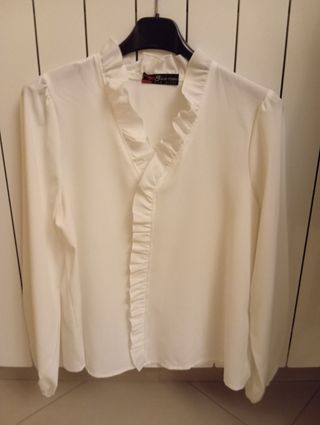 Elegante camicia da donna con dettagli a rouches. Un capo raffinato e versatile. - Maniche lunghe. - Scollo a V con rouches. - Chiusura senza bottoni.