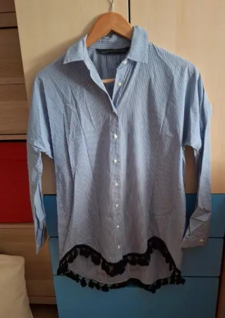 Camicie Zara tutte dello stesso design ma di diverso colore. Bianca, nera e a righe blu e bianche. Sono un po' più corte davanti che dietro. Collo classico. Manica lunga. Taschino sul petto. Le 3 a 15 euro. Per camicia 6 euro.