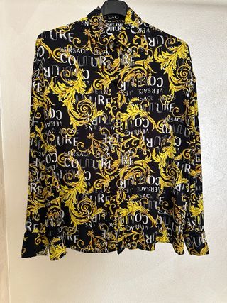 Camicia a maniche lunghe con un vistoso motivo stampato. Tessuto setoso e di buona qualità. Design con linee bianche su sfondo nero. Colletto alla francese. Chiusura con bottoni. Taglia M larga. Nuova e in perfette condizioni.