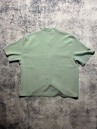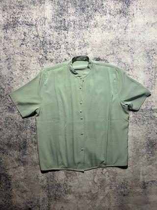 Elegante camicia in seta color menta. Design con colletto mao. Chiusura con bottoni. Manica corta. Dettaglio di sottili pinces verticali.