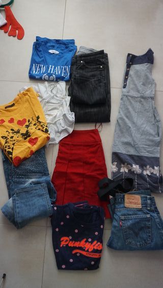 Abbigliamento da donna, taglia S. Varie marche e stili. Il lotto include vari capi in buono stato. - Camicie e bluse. - Pantaloni jeans e altri. - Gonne. - Alcuni capi presentano stampe. Controlla le foto per i dettagli, tutto ciò che è nelle foto, alcune marche, pantaloni Levis, ecc., buono stato, consegna a mano o spedizione, ho altre cose in vendita, guarda il mio profilo, grazie.