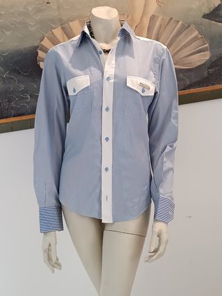 Bellissima Camicia Rossodisera tg. S Nuova, colore blu con le sfumature, 100% cotone, made in Italy, con le strazz ricamati sul torace, 2 tasche piccole esterni. Lunghezza 70 cm., manica 64 cm., spalle 42 cm., torace/ ascelle 50 cm., vita 41 cm.
