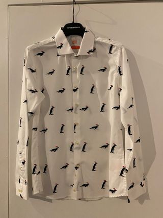 La camicia è stata usata pochissimo, come nuova. Il colore azzurro / blu brillante ricorda il "Blu Tiffany", il colletto ha due botton down, nella parte posteriore del colletto è inserito un bottone con asola in filo giallo fluo, vestibilità "slim fit". La camicia è lunga cm 70, le spalle misurano cm 38 ed il torace cm 50, le maniche sono lunghe cm 63.