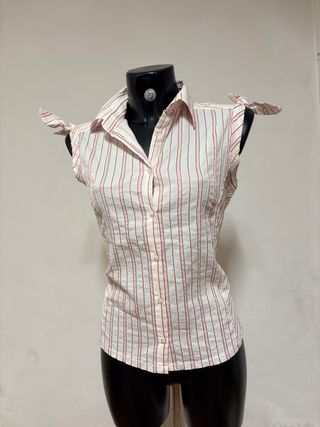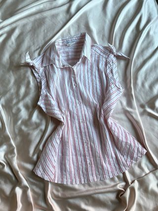Camicetta vintage a righe, perfetta per un look coquette. - Design senza maniche. - Dettagli a fiocco sulle spalle. - Chiusura con bottoni frontali. Ha una piccola macchia sul davanti #y2k #fairy #coquette #vintage #lita #50s