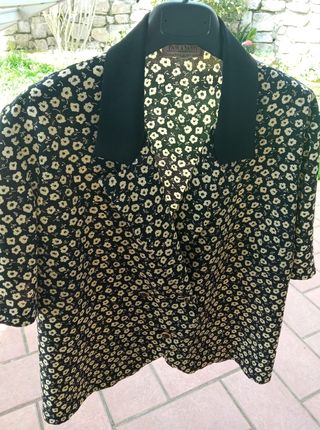 Camicetta da donna taglia M in poliestere, fantasia floreale su sfondo nero, collo con volant e abbottonatura frontale.