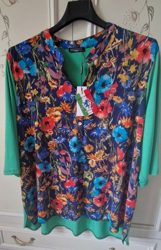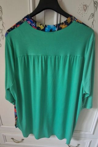 Camicia estiva donna Taglia 4xl/5xl Viscosa elastico Con collo a v e bottoni con maniche tre quarti Un pezzo più lunga dietro Davanti con fiori dietro e maniche colore unico Lunghezza davanti cm 72 Lunghezza dietro cm 76 da ascella ad ascella cm 74 larghezza spalle cm 46