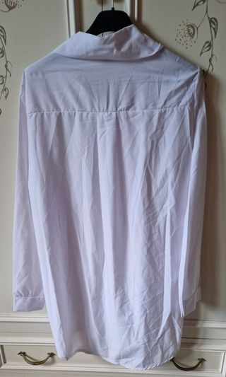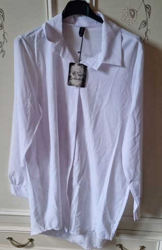 Bellissima camicia bianca, leggera e dal taglio ampio. Perfetta per la primavera o l'estate. Lunghezza cm 84 Da ascella ad ascella cm 52 Larghezza spalle cm 40 Poliestere elastico - Maniche lunghe. - Collo classico. - Chiusura con bottoni.