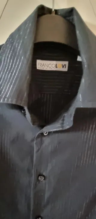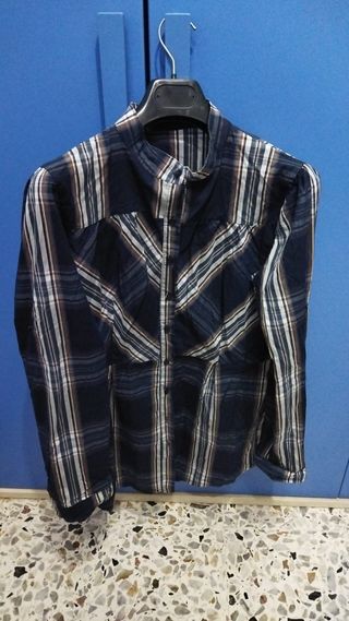 Camicia donna manica lunga in laminata blù e nero con un unico bottone,ma con bottone di riserva, ottimissime condizioni,spalle 45 ascelle 52 lunghezza 80 molto elegante.