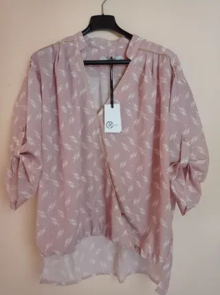 Camicetta Relish taglia L con stampa unica e dettagli dorati. Nuova con cartellino - Stampa a fulmini bianchi su fondo rosa. - Dettagli dorati lungo il collo e le spalle. - Maniche a 3/4 arrotolabili. - Design a portafoglio con chiusura incrociata.