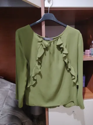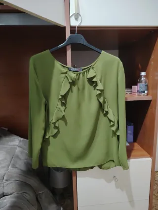 Elegante camicia verde con dettagli a volant. - Maniche lunghe. - Scollo rotondo. Taglia EU36