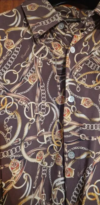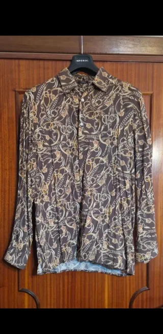 Camicia da uomo con una fantasia unica. - Fantasia con catene dorate e dettagli. - Colore di base marrone scuro.