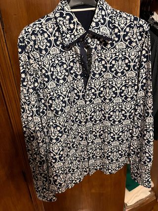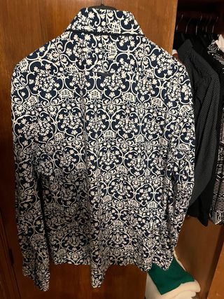 Camicia a maniche lunghe, senza taschino e chiusura a bottoni, collo alla coreana Marca Nara Camicie. Taglia XXL. Fantasia a righe bianche su fondo tinta unita blu scuro. Materiale cotone, viscosa, poliestere ed elsatane. È stata indossata pochissime volte, conservata in ottime condizioni, non presenta imperfezioni di alcun tipo. 🧍 Possibilità di consegna a mano! 🌸Disponibile per ulteriori foto e informazioni!