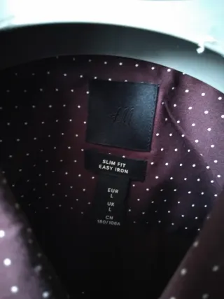 Camicia da uomo H&M in un elegante color bordeaux con un motivo a pois bianchi. Un capo versatile per diverse occasioni. - Fantasia a pois bianchi su sfondo bordeaux. - Colletto classico. - Chiusura frontale con bottoni.