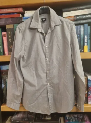 Camicia da uomo H&M in fantasia grigia. Modello a maniche lunghe con colletto classico e chiusura a bottoni. Tg S - Fantasia a micro-trama. - Bottoni bianchi. - Polsini con bottone.