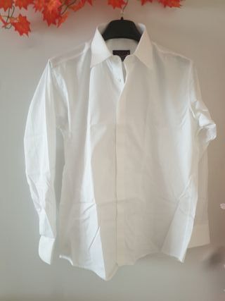 Ap?omb - Camicia elegante uomo Slim-Fit – Taglia 39 (15½) Camicia bianca in cotone 100%, con trama a spina di pesce. Vestibilità slim-fit, colletto classico e polsini con bottoni. Ottime condizioni, indossata pochissimo. Dettagli: Spalle: 42 cm Petto: 50 cm Lunghezza: 70 cm Iniziali ricamate sul fondo della camicia Perfetta per look eleganti o formali.