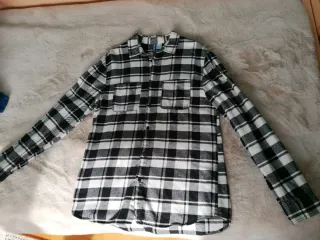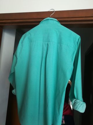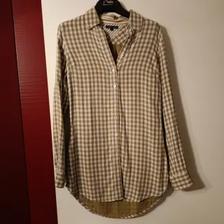 Camicia da donna a maniche lunghe con fantasia a piccoli quadri. - Camicia sportiva con canoncino dietro e stondata al fondo - Bella da portare anche annodata in vita - Maniche lunghe con polsino e bottone - Colore fantasia piccoli quadretti verde/bianco - Chiusura con asole e bottoni bianchi - Taschino sul petto con ricamo - Materiale: cotone, ma manca etichetta. - Lunghezza cm. 69 ESCLUSO pantalone che trovi comunque nel mio catalogo