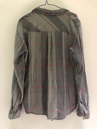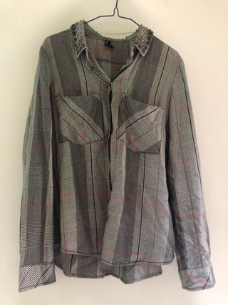 Camicia a quadri con un design unico. - Fantasia a quadri grigia con accenti rossi. - Collo decorato con borchie e perline. - Due tasche sul petto.