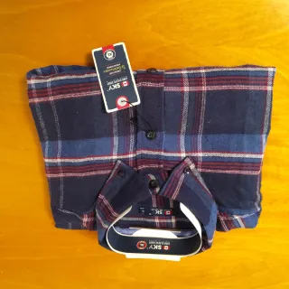 Camicia a maniche lunghe con profili blu. Taglia M - Scollo a V con bordino blu. - Chiusura con bottoni. - Due tasche sul petto - Polsini con bottone e bordino blu.