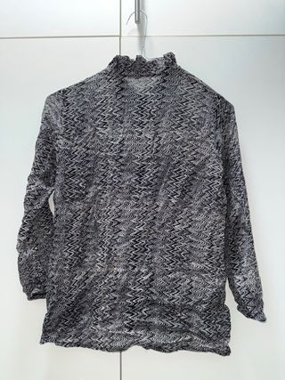 Camicetta estiva con fantasia a zig-zag. Presenta un collo alto arricciato e chiusura con bottoni. - Tessuto leggero e trasparente. - Maniche lunghe. - Bottoni bianchi. - Collo alto con volant.