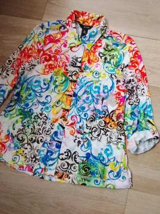 Vendo bellissima camicia a maniche lunghe firmata Terranova. Il capo presenta una fantasia patchwork molto dettagliata che unisce motivi Paisley e geometrici in tonalità calde (marrone, ocra, bordeaux e blu). Brand: Terranova. Taglia: L (vestibilità regolare). Materiale: Cotone leggero, ideale per la primavera o sotto un maglione. Dettagli: Chiusura classica con bottoni, colletto standard e fondo arrotondato. Condizioni: Ottime, indossata pochissimo, colori ancora molto vivaci.