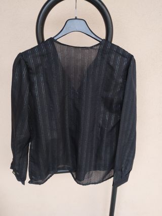 Camicia Nera in Lurex a Righe leggera Taglia M Lunghezza cm 60 Spalle cm 40 Da ascella ad ascella cm 50 Semi trasparente con righe in lurex multicolori su fondo nero. 100% poliestere Maniche lunghe chiusura bottone. Chiusura 3 bottoni e 1 bottone automatico su scollo a V Bellissima camicia/blusa nera caratterizzata da sottili righe verticali in lurex argento multicolore che donano un punto luce discreto ed elegante. Il tessuto è leggermente trasparente (effetto vedo-non-vedo), perfetto per una serata speciale o per un look ufficio ricercato se abbinata a un top sottostante. #camicia #blusa #lurex #nero #argento #chemisier #vintage