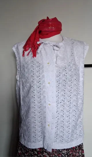 Camicia smanicata bianca in pizzo s.gallo di cotonecon dettagli traforati, bottoni e fiocco sul davanti - Tessuto leggero e traspirante. - Design traforato. - senza colletto Misure: Spalle 46 cm cmlungh.60cm Da ascella a ascella 56cm