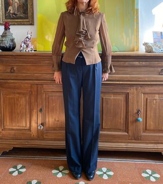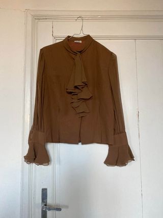 Camicetta vintage sartoriale color cacao in voile di seta, corpetto foderato, mentre le maniche sono trasparenti, collo coreano e volant sul collo e sui polsi. Molto particolare ed elegante. Taglia S. Misure in cm: Spalle 40 Maniche 59 Petto 46 Vita 42 Lunghezza 53 - Dettaglio con fiocco e ruches sul davanti. - Maniche lunghe con polsini a campana.
