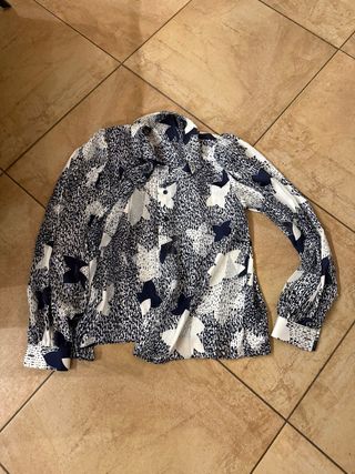 Camicia da donna con stampa leopardata e maniche lunghe. Un capo versatile e di tendenza. Colori nero grigio bianco. In buono stato. - Fantasia animalier. - Colletto classico. - Chiusura con bottoni.