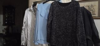 Set di camicie eleganti, perfette per ogni occasione speciale. - Camicia color argento con texture. - Camicetta azzurra con volant. - Maglioncino nero scintillante.
