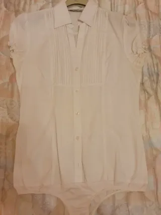 •Camicia bianca a tinta unita. •Colletto classico. •Maniche lunghe con bottone apribile sui polsini. •Sulle spalle (sia avanti che dietro) presenta una trasparenza decorata con fiori bianchi ricamati. •Davanti, nella parte superiore della camicia, presenta 4 bottoni apribili. •Il bordo inferiore è arricciato ed elasticizzato. •Difetto: c'è una piccola macchia nella parte anteriore destra. 100% cotone 100% nylon 100% poliestere Taglia M Cache Cache ⚠️Potete fare anche offerte⚠️