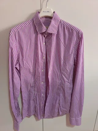 Bellissimo set di quattro camicie da uomo, in puro cotone. Perfette per ogni occasione! Controllate le misure.collo 41 cm. Spalle 47 cm. Da ascella ad ascella è 58cm. Lunghezza 76 cm. - Sono a maniche lunghe. - Due sono blu, una rosa e una a righe. - Sono in ottime condizioni.