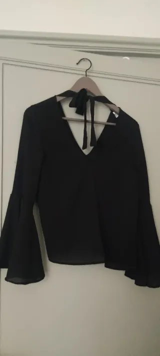Elegante camicia nera con un design moderno. - Maniche svasate a campana. - Scollo a V profondo. - Chiusura con lacci sul retro.
