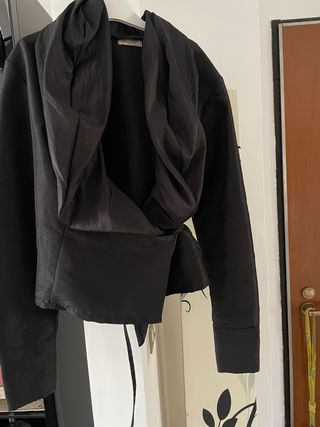 Elegante camicia da donna con un design unico e raffinato. - Tessuto leggero e fluido. - Drappeggio frontale asimmetrico. - Maniche lunghe con polsini. - Chiusura con laccetti sul retro.