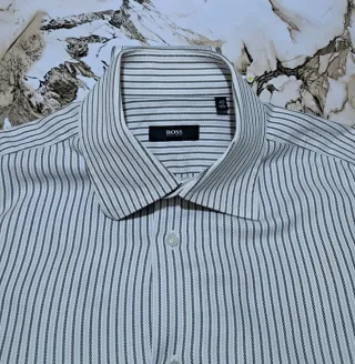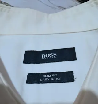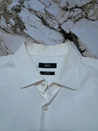Camicia elegante Hugo Boss originale, colore bianco. Modello Slim Fit in cotone • Nota: l'etichetta della taglia è mancante, ma in base alle misure prese equivale a una taglia L. • ⚠️ Condizione: Il colletto presenta un alone giallastro dovuto all'uso. Viene venduta a prezzo ridotto (8,50€) perché il colletto è da trattare con prodotti specifici o lavanderia.