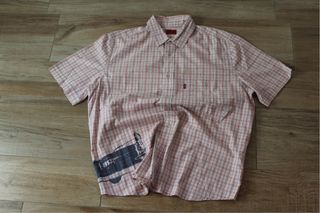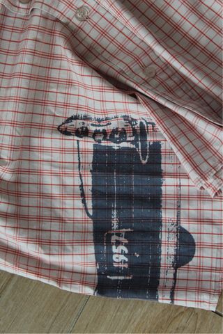 Camicia a quadri da uomo con maniche corte. - Fantasia a quadri rosa e bianchi. - Logo Red Tab applicato. - Stampa grafica sul fondo.