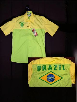 Camicia a maniche corte ispirata al Brasile, con un design bicolore. - Design a pannelli. - Stampa BRAZIL sul retro. - Bandiera del Brasile sul retro.