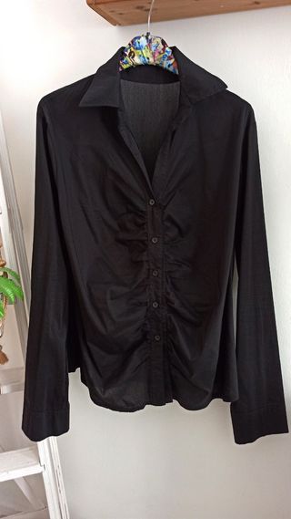 Elegante camicia da donna in morbido ed elasticizzato tessuto colore nero, con un design drappeggiato sul davanti. Perfetta per un look sofisticato. - Maniche lunghe. - Chiusura con bottoni. - Collo a camicia. Misure: lunghezza dal punto spalla all'orlo cm. 73 Circonferenza punto ascella cm. 120 Lunghezza manica cm. 69 compreso polsino.