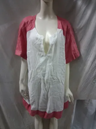 Camicia in puro lino con un design a blocchi di colore. La parte superiore e le maniche sono in un vivace color rosa, mentre il corpo principale è in bianco. - Scollo a V profondo. - Maniche corte. - Orlo inferiore a contrasto.