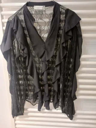 Elegante camicia nera in pizzo HAVEONE praticamente nuova. Bellissima - Maniche lunghe in pizzo. - Scollo a V con volant. - Tessuto leggero e trasparente.