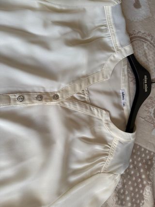 Camicia senza bottoni davanti, con un unico bottone dietro al collo, vouolant davanti e dietro e sopra una manica. In velo.