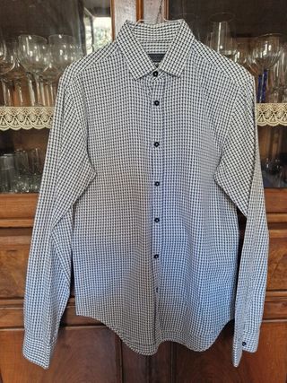 Camicia uomo cotone slim fit bianca e nera con piccoli disegni 2 bottoni al polsino. Ampiezza spalle 40 cm / Lunghezza 68 cm